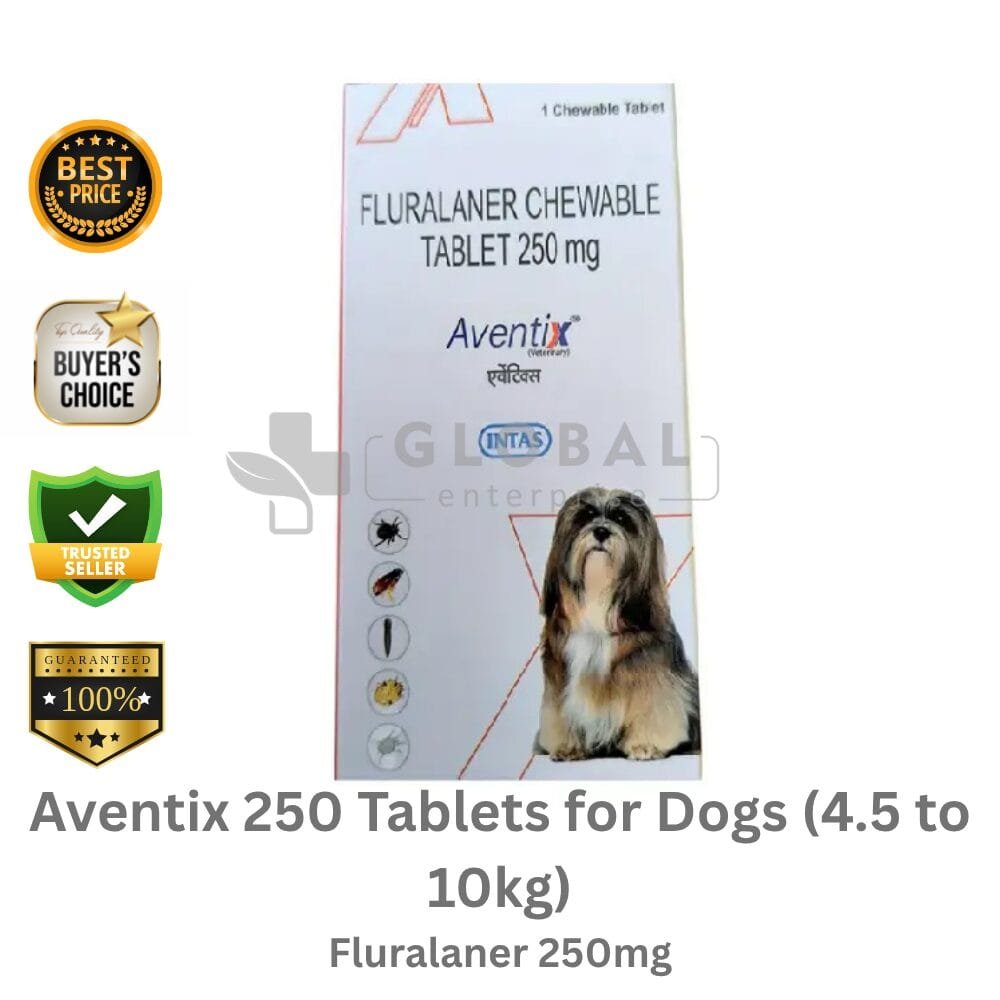 Active ingredient: Fluralaner 250mg Medicine name: Aventix 250 Tablets for Dogs (4.5 to 10kg) Manufacturer: Intas Pharmaceuticals Dosage type: Chewable Tablet Packaging: 1 Chewable Tablet