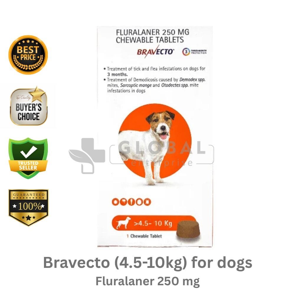 Active Ingredient -Fluralaner 250mg Name – Bravecto (4.5-10kg) for Dogs Manufacturer- Msd Animal Health Dosage Type – Chewable Tablet Packing- 1 Chewable Tablet Per Pack