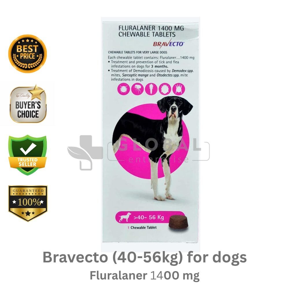 Active Ingredient -Fluralaner 1400 mg Name – Bravecto (40-56kg) for dogs Manufacturer- Msd Animal Health Dosage Type – chewable tablet Packing- 1 chewable tablet per pack