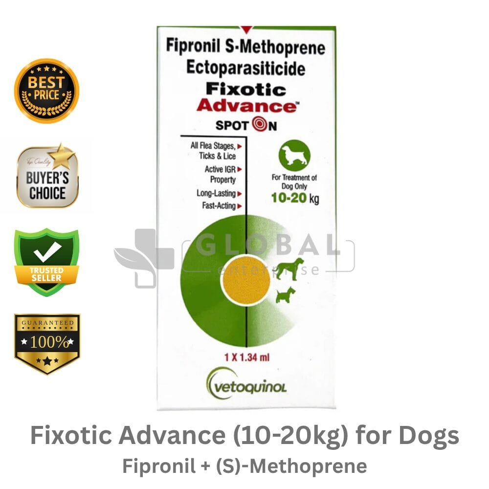 Active Ingredient – Fipronil (9.8% w/v) S-Methoprene (8.8% w/v) Name – Fixotic Advance (Upto 10kg) for Dogs Manufacturer- Vedoquinol Dosage Type – Shot on Packing- 1 *0.67ml