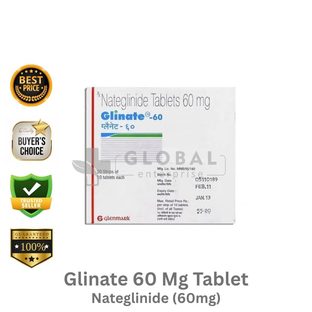 Active Ingredient – Nateglinide 60mg Name – Glinate 60 Mg Tablet Manufacturer- Glenmark Pharmaceuticals Dosage Type – Tablet Packing- 10 Tablet In a Bottle