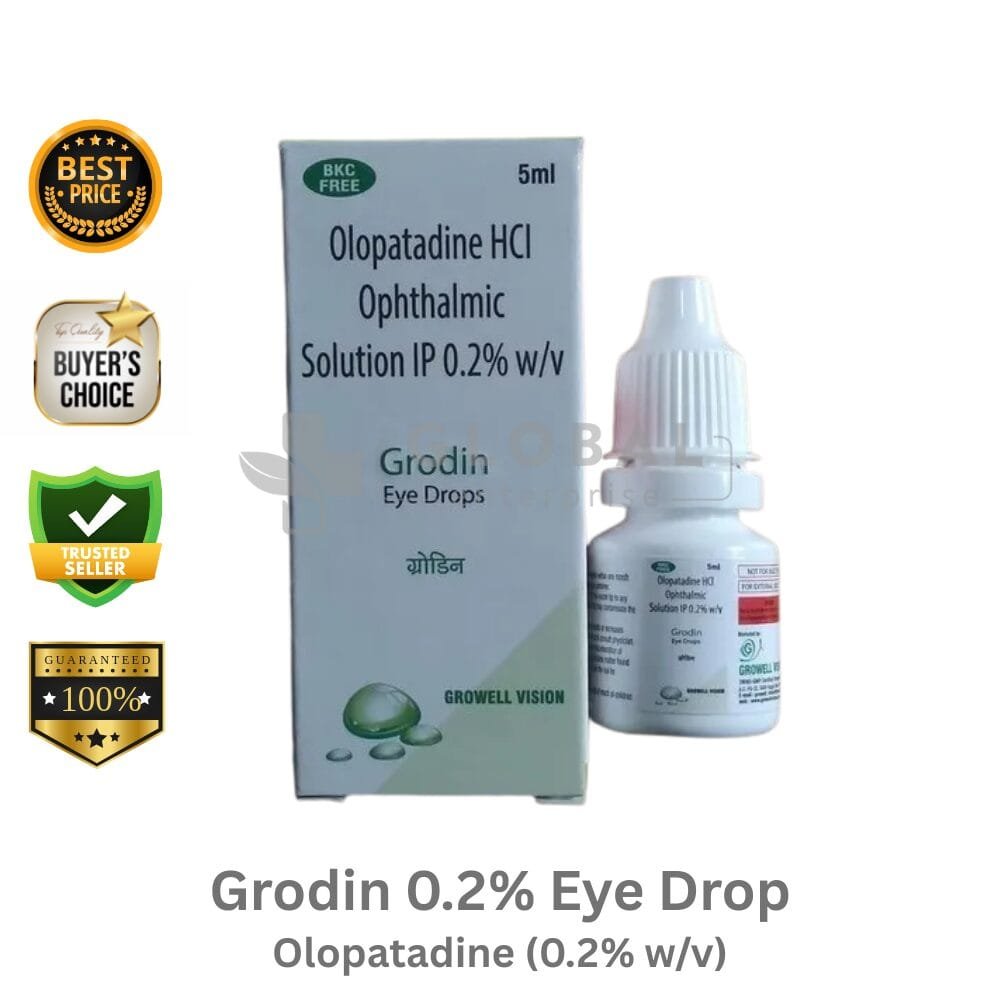 Active Ingredient – Olopatadine hydrochloride 0.2% w/v Name – Grodin 0.2% Eye Drop Manufacturer– Growell Vision Dosage Type – Ophthalmic Solution Eye Drops Packing– 5mL Dropper Bottle