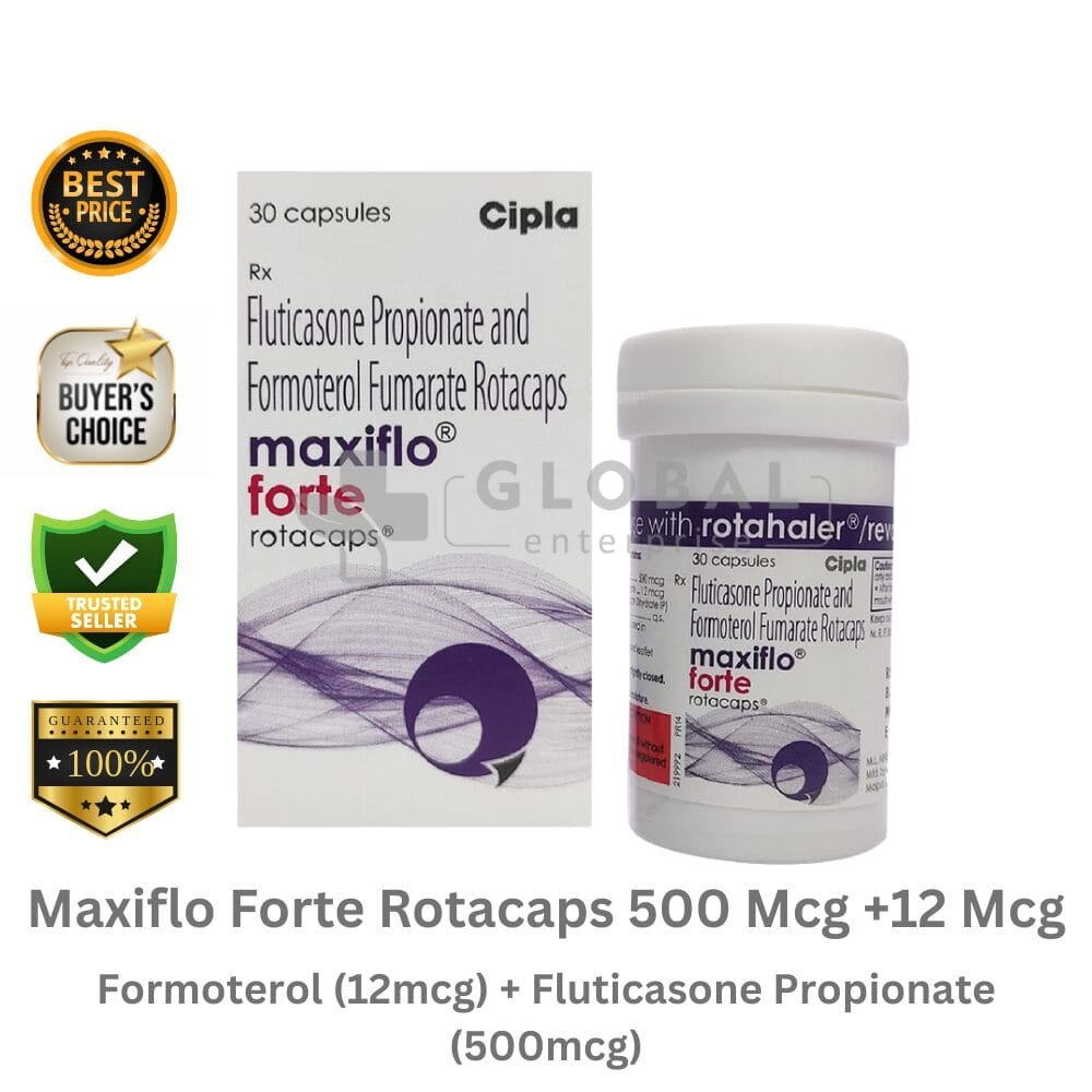 Active Ingredient – Fluticasone Propionate 500mcg and Formoterol Fumarate 12mcg Name – Maxiflo Forte Rotacaps 500Mcg +12Mcg Manufacturer– Cipla Ltd. Dosage Type – Inhalation Rotacaps Packing– 30 of Rotacaps