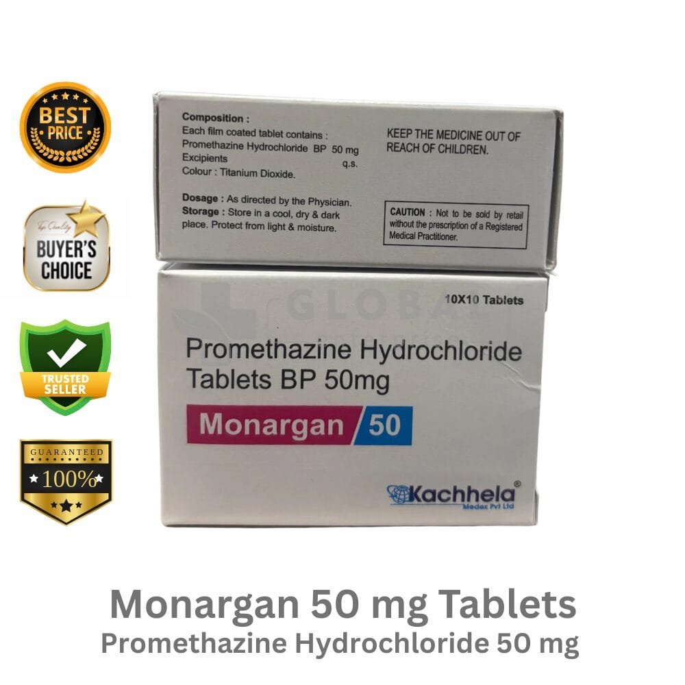 Active Ingredient – Promethazine HCL 50mg Name – Monargan 50mg Tablet Manufacturer – Kachhela Medex Pvt Ltd Dosage Type – Oral Tablet Packing – 10 Strips of 10 Tablets Each