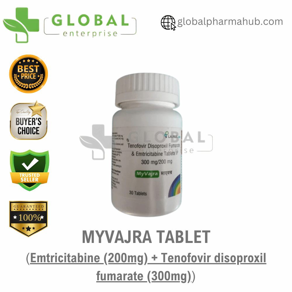 Active Ingredient: Emtricitabine 200mg and Tenofovir disoproxil fumarate 300mg Name: Myvajra Tablet Manufacturer : Laurus Labs Limited Dosage Form: Tablet (oral) Packing: Bottle of 30 Tablets