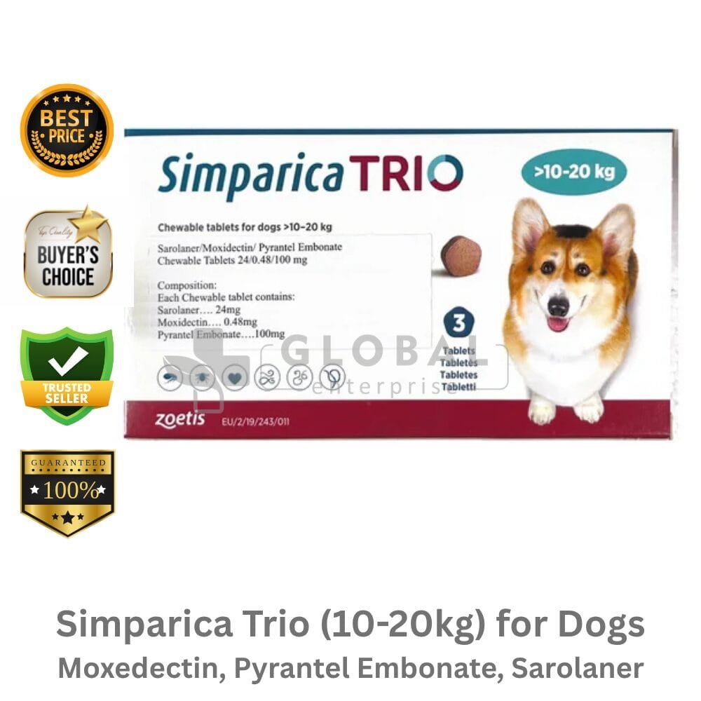 Active Ingredient – Sarolaner 24mg and Moxidectin 0.6mg and Pyrantel 100mg Name – Simparica Trio (10-20kg) for Dogs Manufacturer -Zoetis Dosage Type – Chewable Tablets Packing- 1 Chewable Tablets
