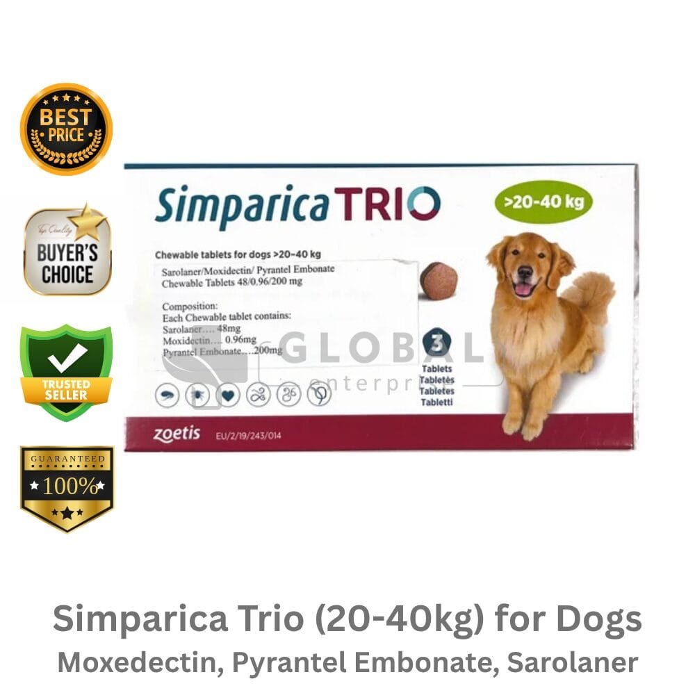 Active Ingredient -Sarolaner, Moxidectin, Pyrantel Name – Simparica Trio (20-40kg) for Dogs Manufacturer – Zoetis Dosage Type – chewable tablets Packing- 1 chewable tablets