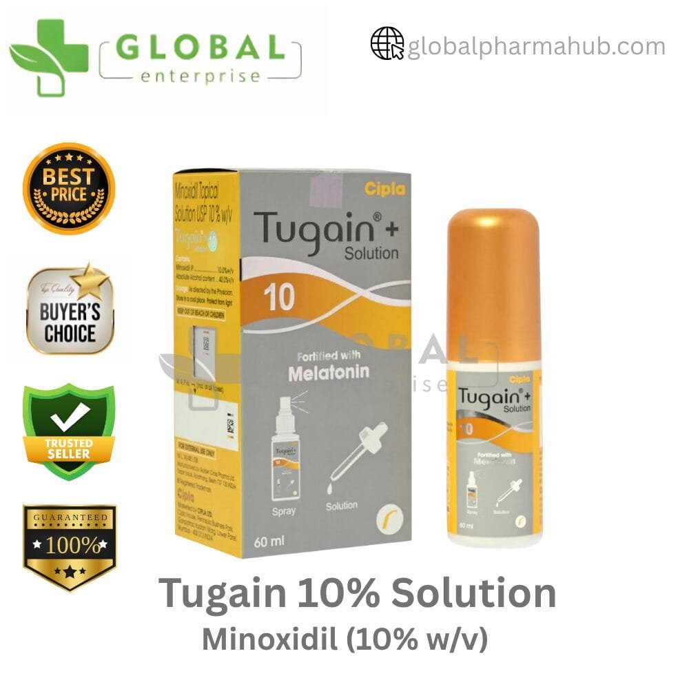 Tugain 10% Solution contains Minoxidil 10% w/v, a high‑strength topical vasodilator used in adult men to manage common hereditary hair loss. It increases blood flow to scalp hair follicles, helping slow progressive thinning and encouraging new hair growth when applied regularly as directed.